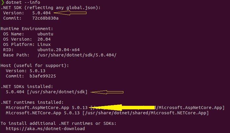 Notice the first arrow is saying 5.0.404 this is the version reflected in global.json of dotnet.
